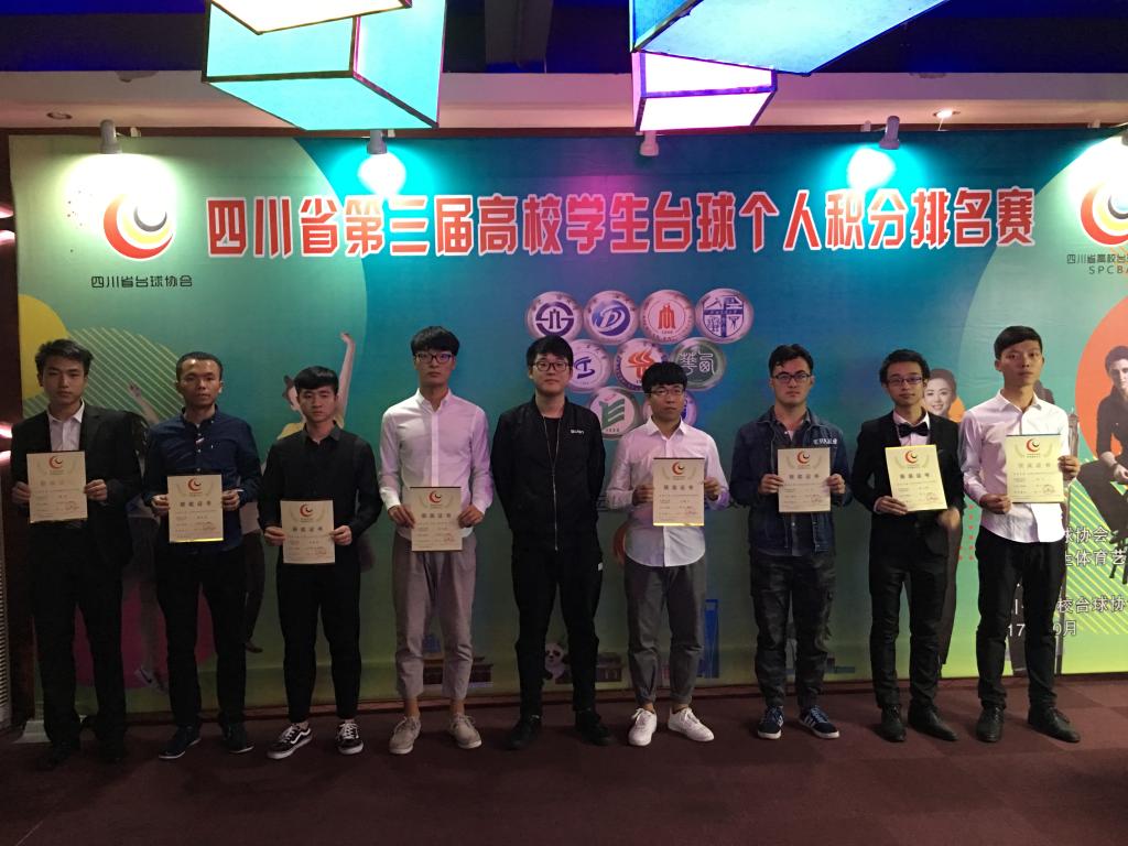 2017年10月27-29日由四川省台球协会、四川省学生体育艺术会主办,四川省高校台球学会承办的四川省第三届高校学生台球个人积分排名赛在成都市点与线台球俱乐举行。本次赛事吸引了全省共计17所高校158名运动员参加。成都信息工程大学派出15名运动员参加了该赛事。经过三天的激烈比赛,成都信息工程大学台球代表队队员肖宇在激烈的角逐中夺得了美式冠军,同时熊浩茹获得美式第五名;斯诺克也取得第五名和第九名好成绩。