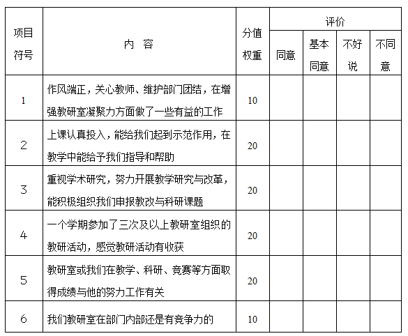 主持教研室全体教师对教研室主任进行考核,考核采取无记名测评方式。6个指标中,选择“同意”的数量达到5个为“A”票,选择“同意”与“基本同意”的数量达到4个为“B”票。