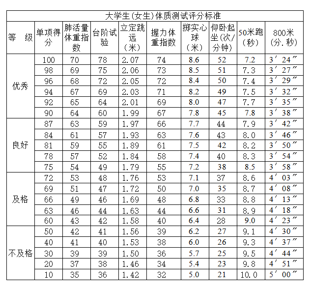 大学生(女生)体质测试评分标准